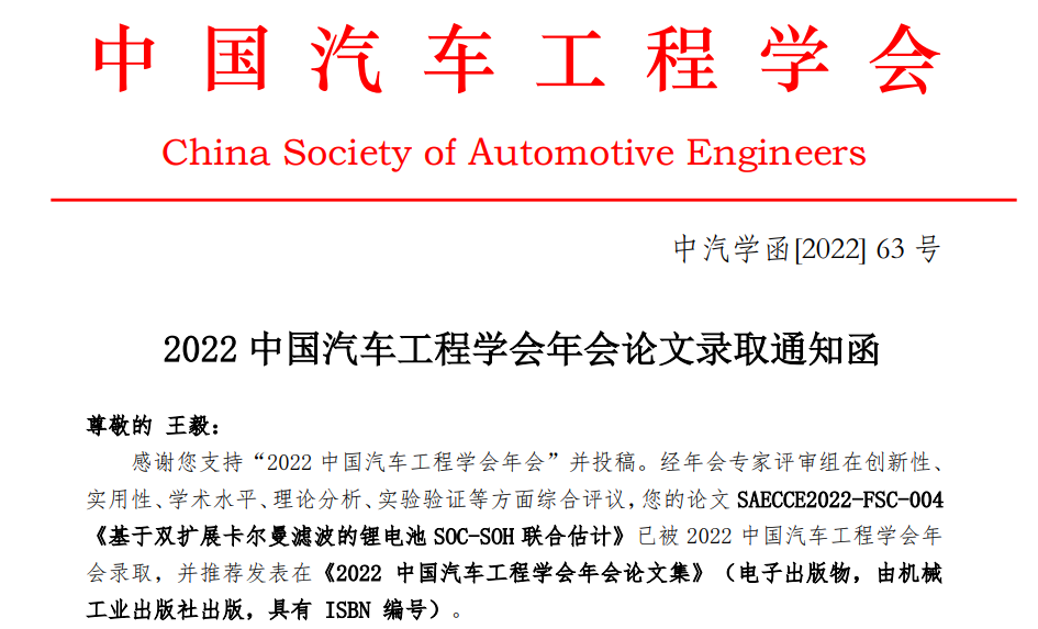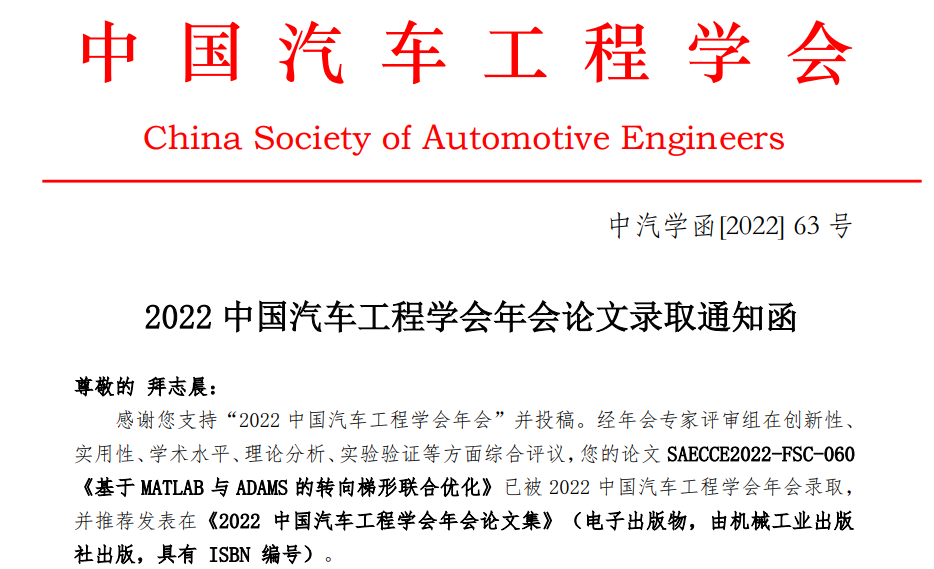 824日,德赢ac米兰官方合作vwin行知车队拜志晨同学(能源与动力工程学院2020级车辆工程专业学生)以第一作者撰写的论文《基于 MATLAB ADAMS 的转向梯形联合优化》及行知车队王毅同学(能源与动力工程学院2019级车辆工程专业学生)以第一作者撰写的论文《基于双扩展卡尔曼滤波的锂离子电池SOC-SOH联合估计》同时被2022中国汽车工程学会年会论文录用!