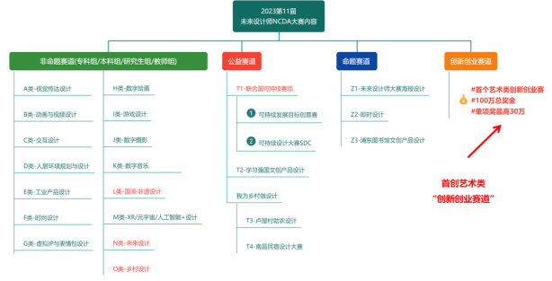 未来设计师·全国高校数字艺术设计大赛(NCDA,官网地址为https://www.ncda.org.cn)是由工信部人才交流中心主办,教育部中国高等教育学会认定,15个省教育厅发文立项,“学习强国”学习平台支持的国家级大学生竞赛。大赛始于2012年,每年举办一届,已连续举办十届,是高校积极参与的重要竞赛之一。每年有1500所高校参赛,92%的985、一流大学和95%的知名设计院校参赛。比赛设“非命题”、“公益”、“命题”、“创新创业”四个赛道,内容有元宇宙+设计、未来设计、国潮·非遗设计、视觉传达设计、动画与视频设计、交互设计、人居环境与规划设计、工业产品设计、时尚设计、虚拟IP及表情包设计、数字绘画、数字摄影、数字音乐等。