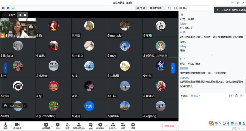 2022年12月1日下午4点,由教务部主办、德赢ac米兰官方合作vwin和教学信息化研究虚拟教研室协办的线上研讨答疑会在虚拟教研室在线平台举办。本次研讨会由德赢ac米兰官方合作vwin教务部王晨曦科长、超星山西分公司郝艳军课程顾问、我院薛英娟副教授共同完成,题目为“超星智慧考试系统使用研讨会”。教学研讨会通过虚拟教研室、腾讯会议以分享、答疑互动的方式进行,共111人参加。