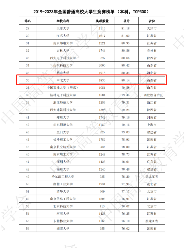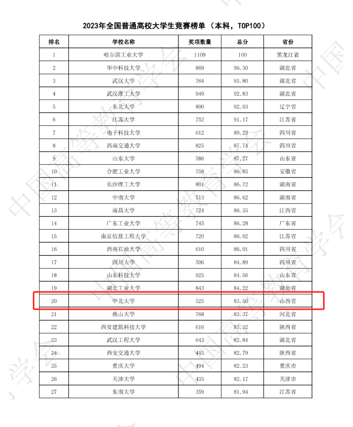 3月22日,教育部中国高等教育学会发布了全国普通高校大学生竞赛第八轮榜单,德赢官网表现出色,以奖项数量525项,总分83.5分的成绩在2023年全国普通高校大学生竞赛榜单(本科,TOP100)中位列全国第20位,山西省首位。在2019-2023年全国普通高校大学生竞赛榜单(本科,TOP300)位列全国第36位。